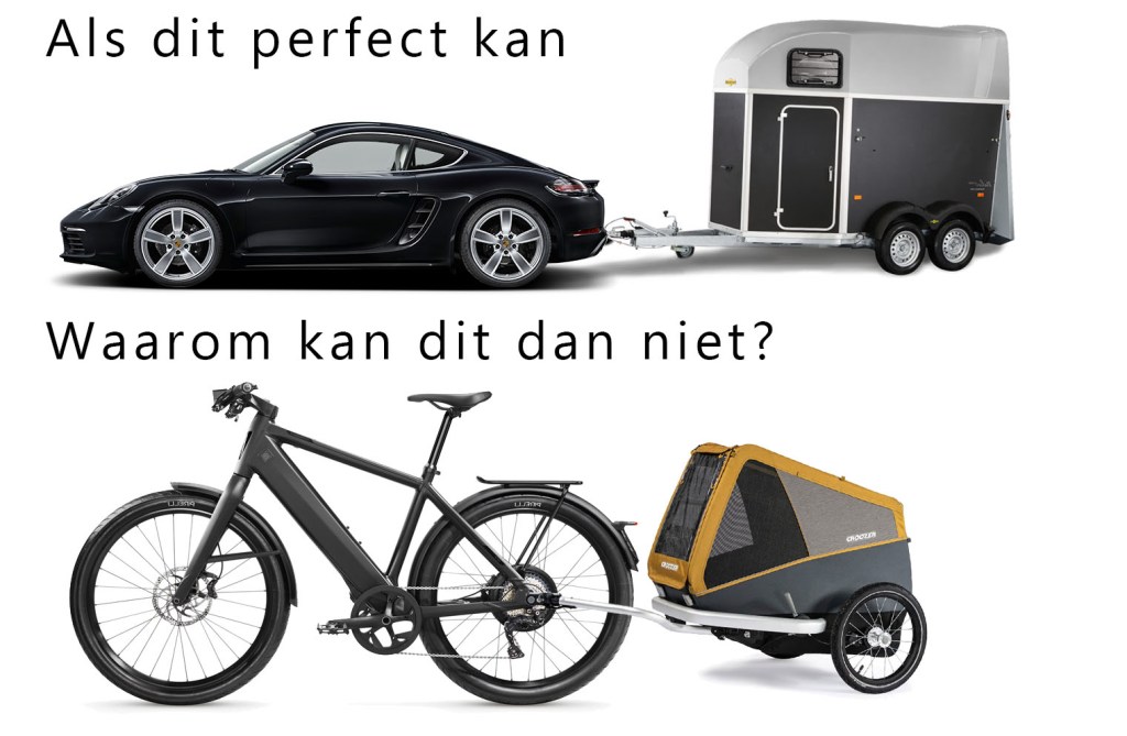 Het bericht handelt trouwens niet over aanhangwagens maar wel specifiek over fietskarren. Het doet de lezer nadenken of een verschillende behandeling van elektrische rijwielen en speed pedelecs op het vlak van fietskarren wel nodig is. Dit komt tevens naar boven in de hoofding “een speed pedelec is ook een gewone elektrische fiets” waarbij gekozen is om ‘elektrisch’ bewust toe te voegen, gezien niet alle elektrische fietsen goedgekeurd zijn om een kar te trekken. Bij de visuele vergelijking met de auto is eveneens bewust gekozen om respectievelijk een paardentrailer en een hondenfietskar weer te geven. Het bericht neemt geen standpunt in over het vervoeren van kinderen. Ook dit is bewust gedaan, om terechte vragen op te roepen gezien een speed pedelec aan lage snelheid dezelfde context biedt als een gewone fiets, waarvoor dank 🙂