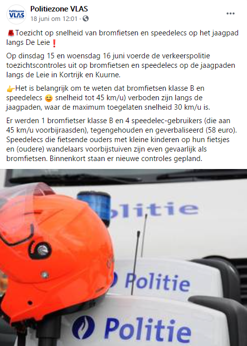 We zijn vanuit ons netwerk in gesprek gegaan met hoofdcommissaris Camerlynck van politiezone VLAS. De politiedienst werd door een aantal burgemeesters gevraagd strenger te controlleren op het jaagpad langsheen de Leie, tussen Deinze en Kortrijk. Dit wegens klachten van andere weggebruikers over het toenemende verkeer aldaar en diens toenemende snelheid.